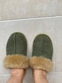 The khaki suede sheepskin slippers create a relaxed, earthy mood. Looks great with beige and other natural tones.
