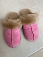 The pink suede sheepskin slippers bring a feminine and romantic flair to your homewear. Soft, charming, and cozy.