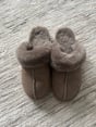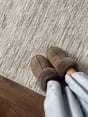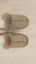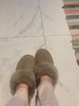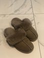 The taupe suede sheepskin slippers offer subtle sophistication and softness, ideal for an elegant home style.